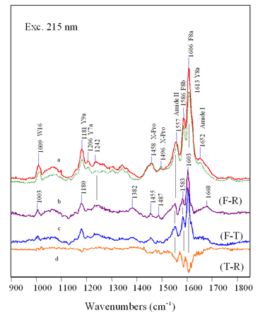 The UVRR studies also showed an increase in Phe signal intensity (FIG 9.5). This increase is consistent with an increase in hydrophobicity of the Phe local environment (FIG 9.6).